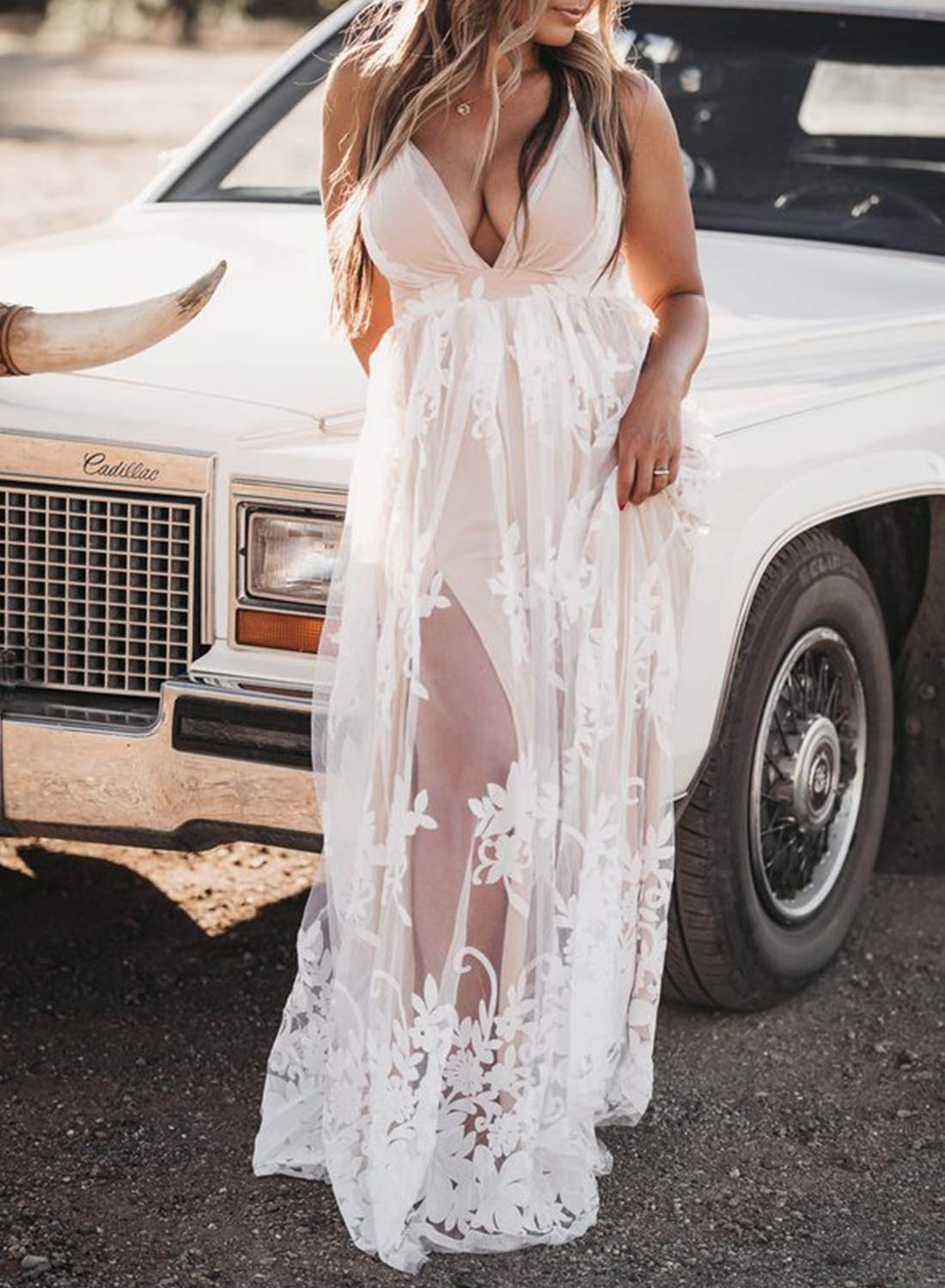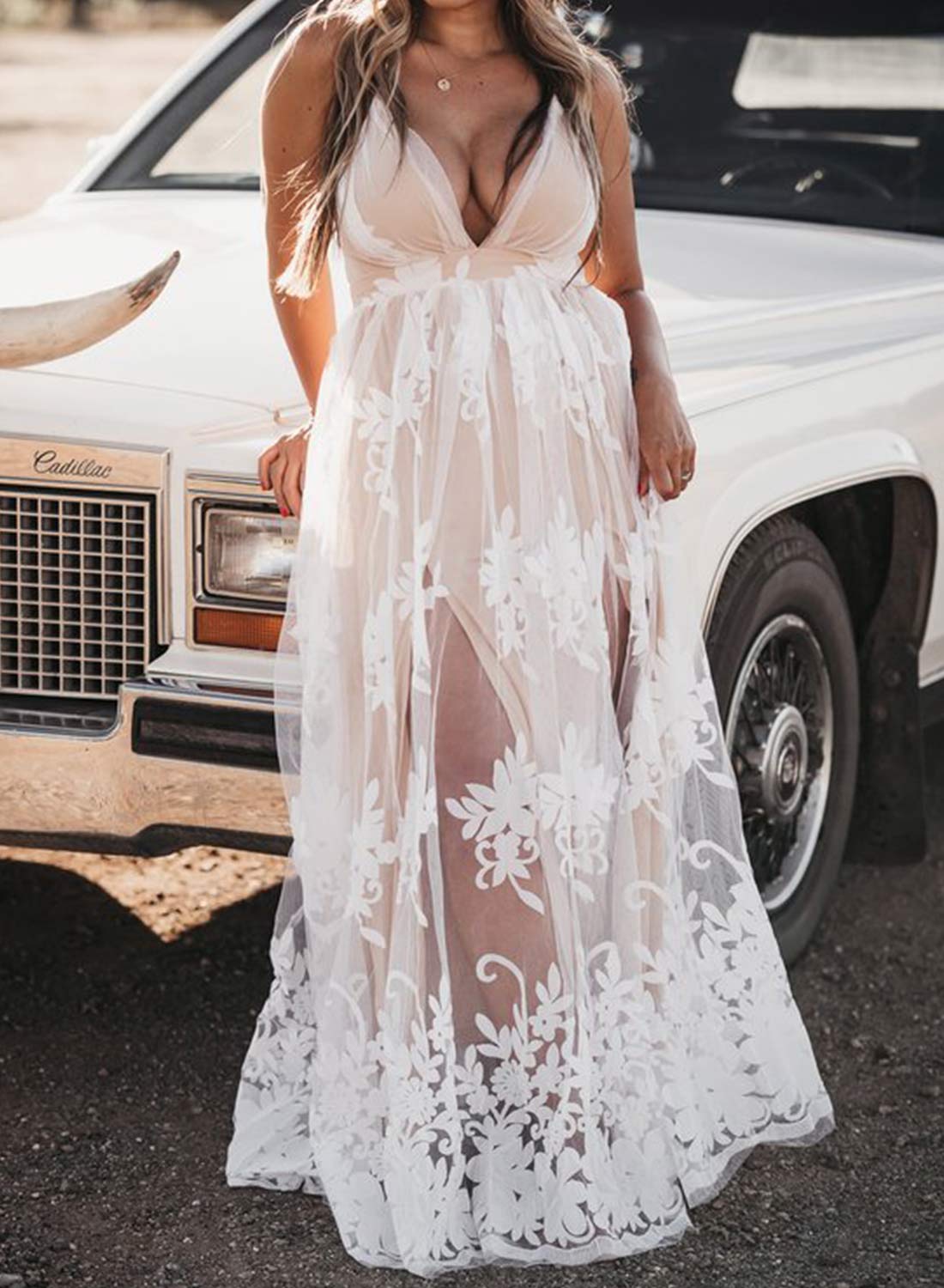 V Neck Sleeveless White Lace Maxi Dress